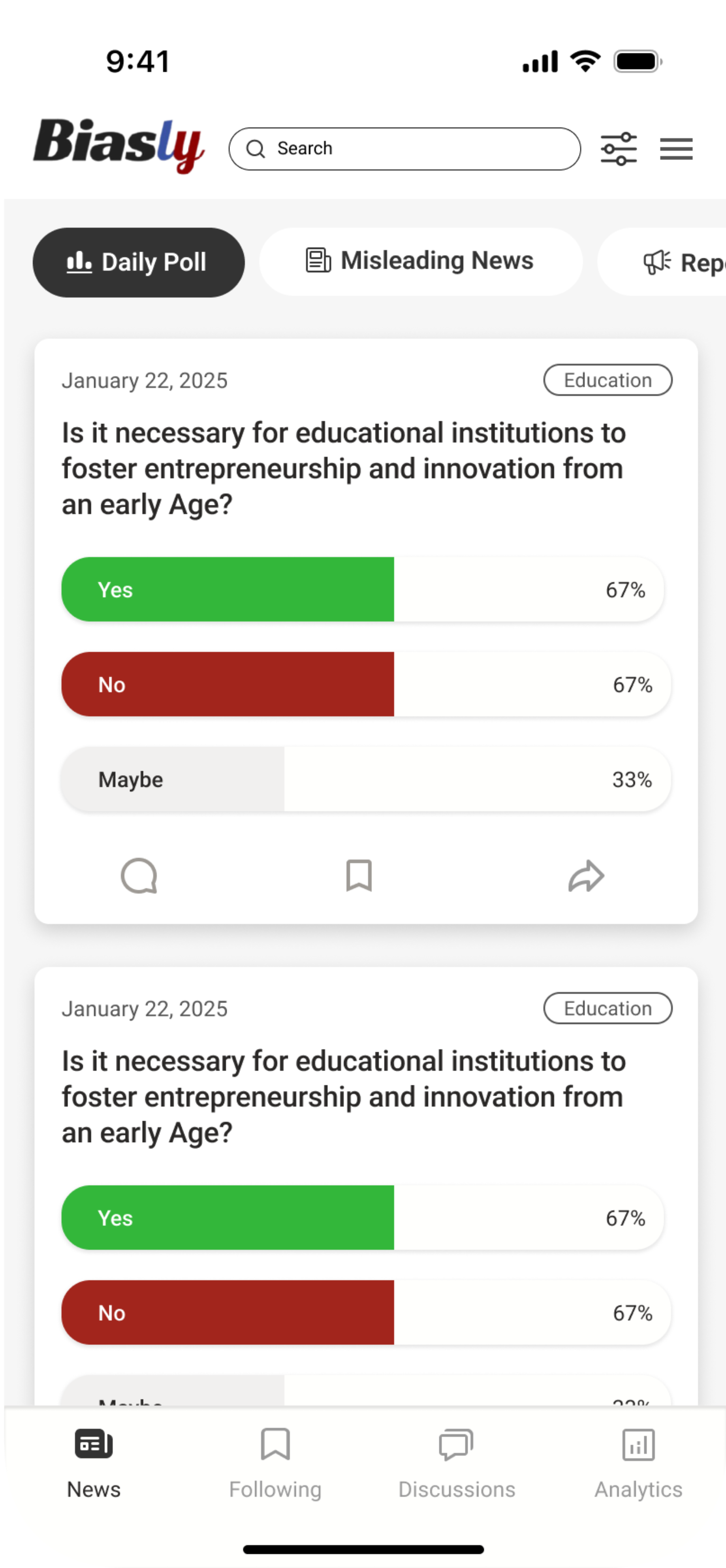 Political information is often overwhelming and hard to navigate. During my UI/UX internship at Biasly, I designed a mobile app that simplifies complex content while maintaining transparency and neutrality