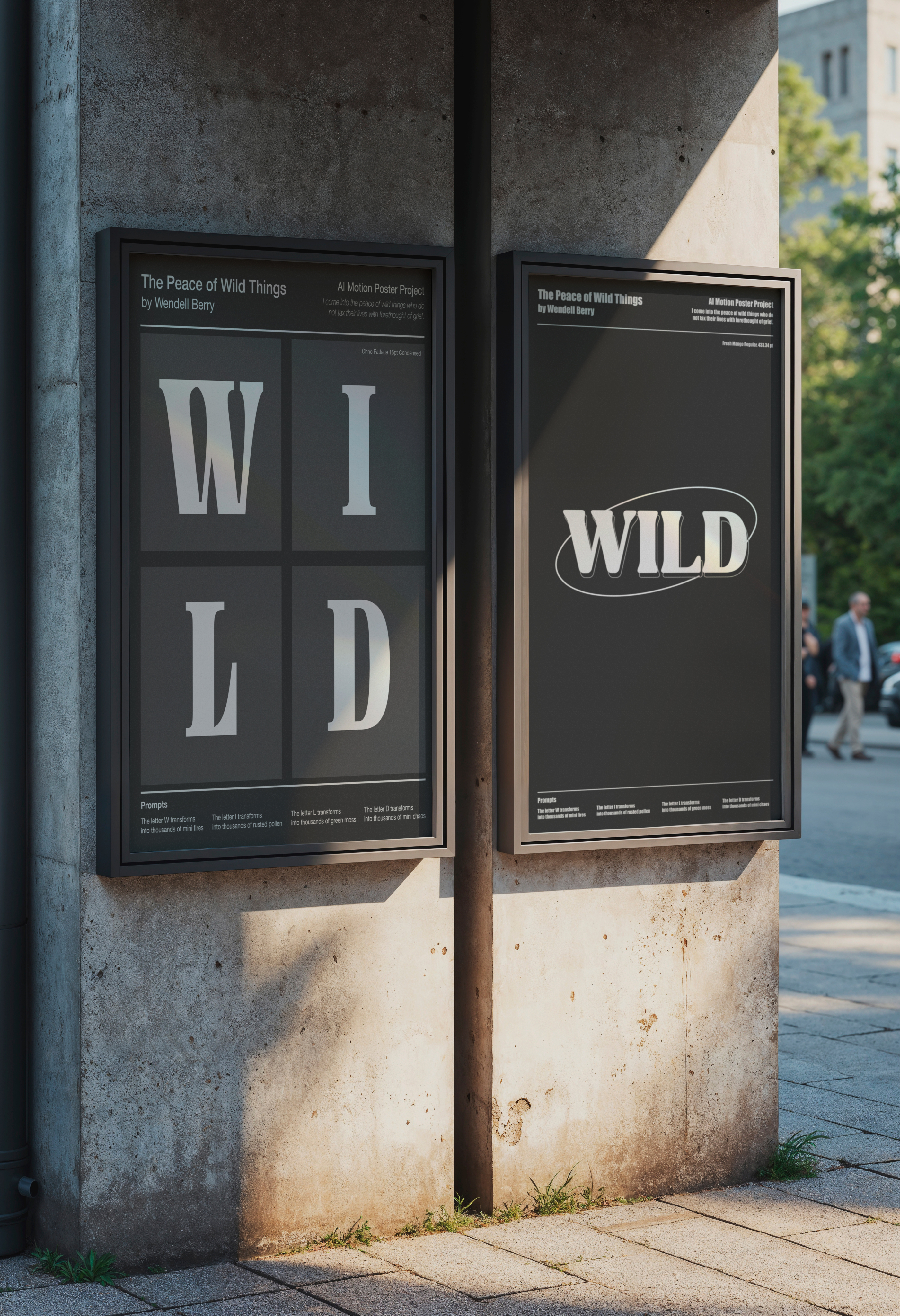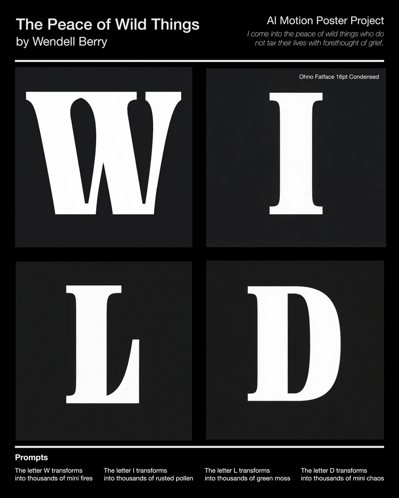 Focusing on the word “wild,” I generated raw, organic visuals using Runway.ai and shaped them into a calm, meditative motion poster inspired by The Peace of Wild Things, balancing untamed energy with gentle pacing.
