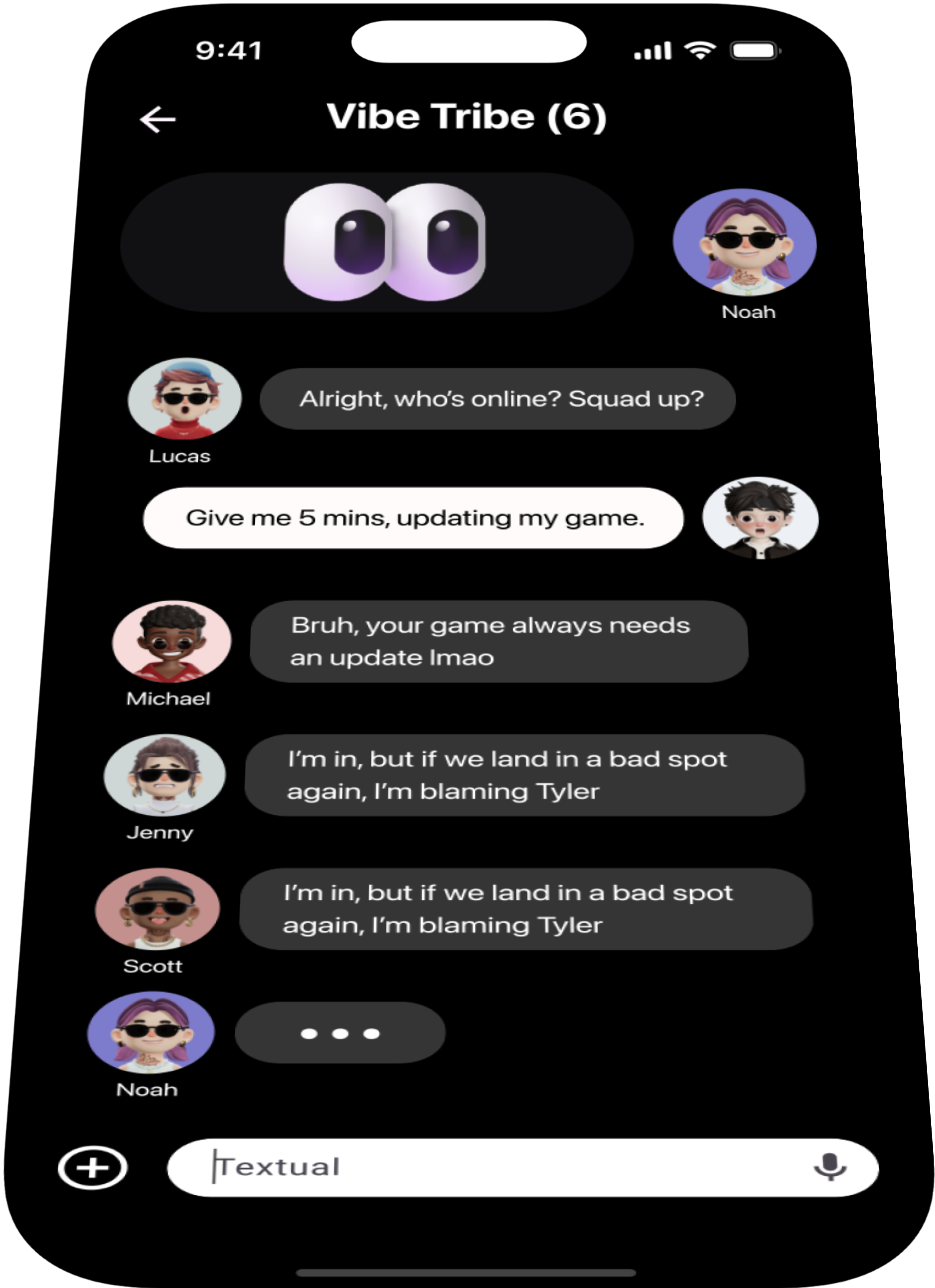 Our goal with Textual was to create a conceptual app that brings warmth and authenticity to texting through expressive character design and visual eye contact.